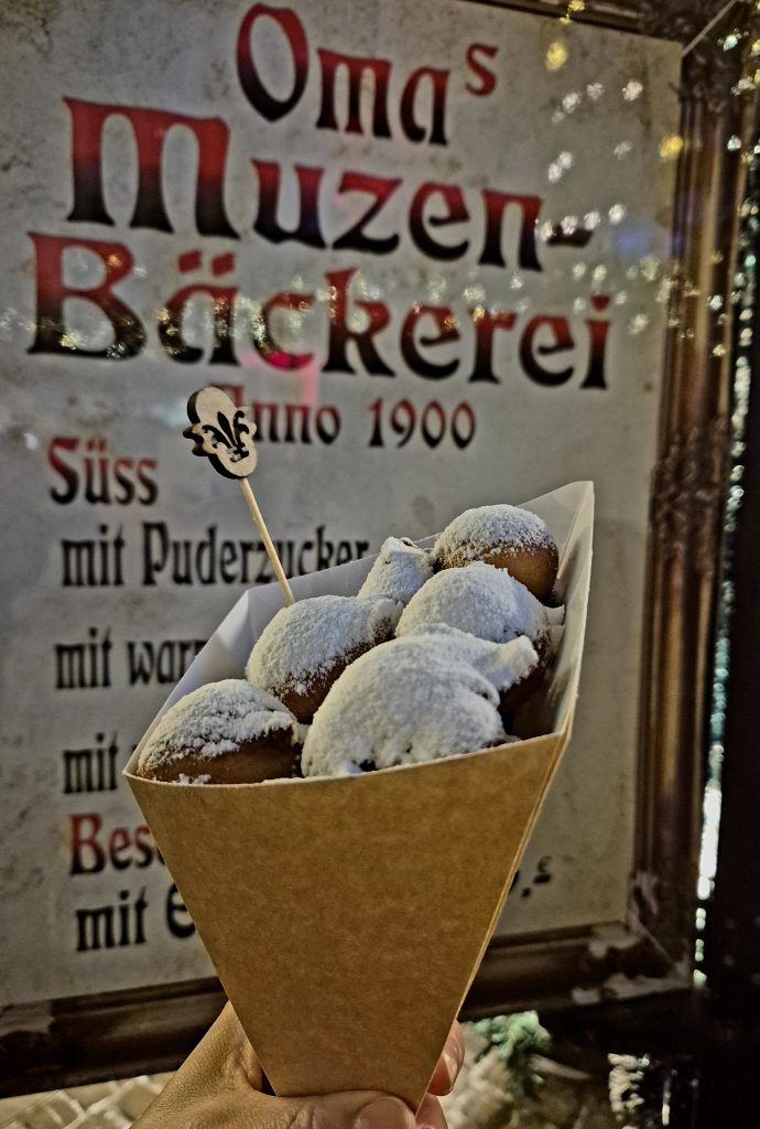 Ebenso einen Besuch wert, ist der „Heinzelmännchen-Markt“, der sich vom alter Markt bis zum Heumarkt erstreckt, inkl. einer Eisfläche, die zum Schlittschuhlaufen einlädt. ⛸️😊 Dieses Jahr habe ich eine kölsche Spezialität probiert, Muzen, ein Fettgebäck. Waren echt lecker 😋, aber auch echt süß und mächtig. 😅