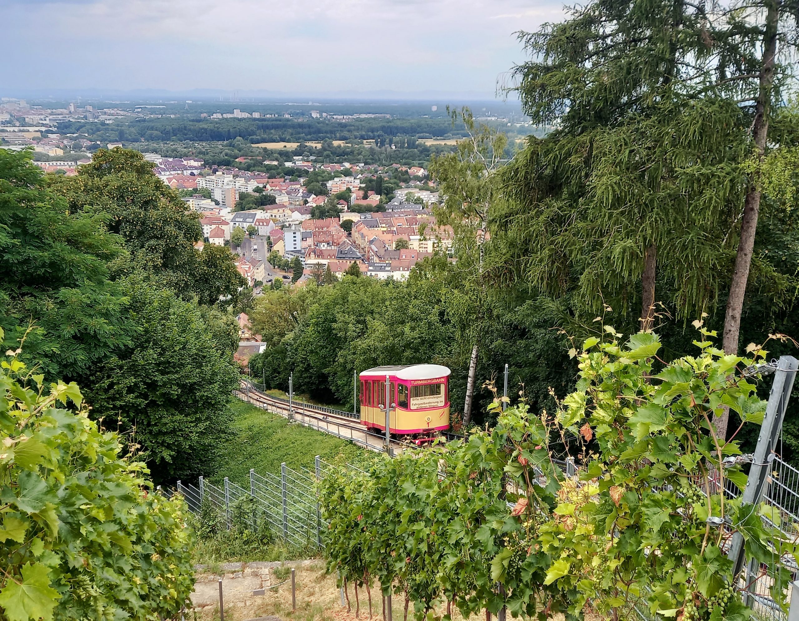 Mit der 1888 erbauten Turmbergbahn, einer Standseilbahn, ging es dann auf den 256 m hohen Turmberg, dem Hausberg und Wahrzeichen von Durlach. Alternativ kann man auch die 529 Stufen, auch „Hexenstäffele“ genannt, bezwingen. Aufgrund der Hitze und Schwüle an diesem Tag habe ich dieses Mal die „faule“ Variante gewählt 😅 und das Hin- und Zurückticket gebucht. Aber die sportliche Variante werde ich auch einmal angehen. 😁