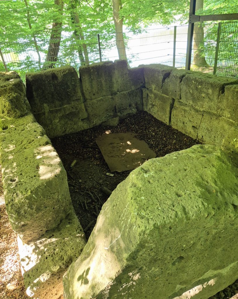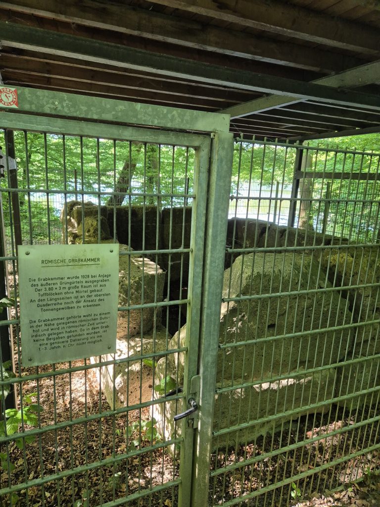 Wir durchquerten das Wasserwerkswäldchen, Teil des Grüngürtels. Dieser ist eine Errungenschaft des damaligen Kölner Bürgermeisters (v. 1917 bis 1933) Konrad Adenauer (Ja, genau… DER Adenauer 😄). Der Grüngürtel bildet linksrheinisch einen ca. 24 km und rechtsrheinisch einen ca. 12 km langen und jeweils ca. 1,5 km breiten „Grünen Ring“ um die Großstadt. Das Wäldchen führte uns zum Kalscheurer Weiher und damit zu einer römischen Grabkammer aus dem 1. bis 3. Jhd., die höchstwahrscheinlich zu einem in der Nähe gelegenen Gutshof gehörte.