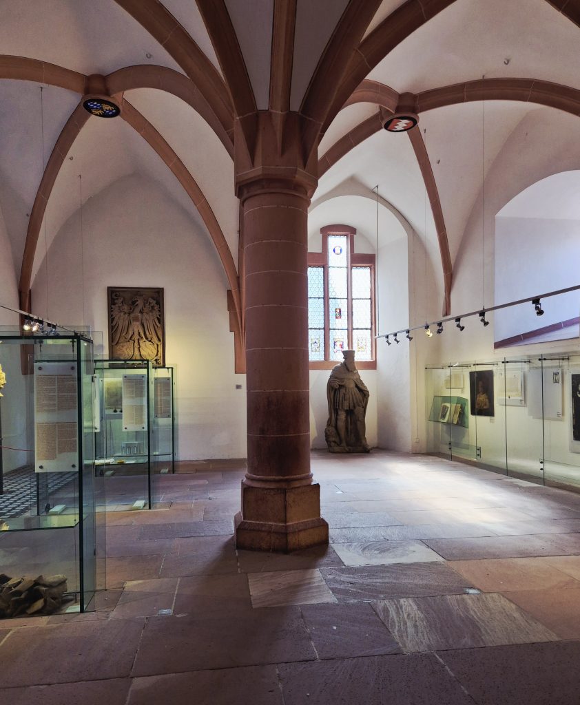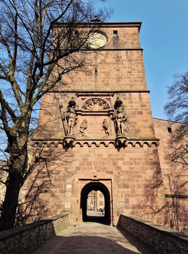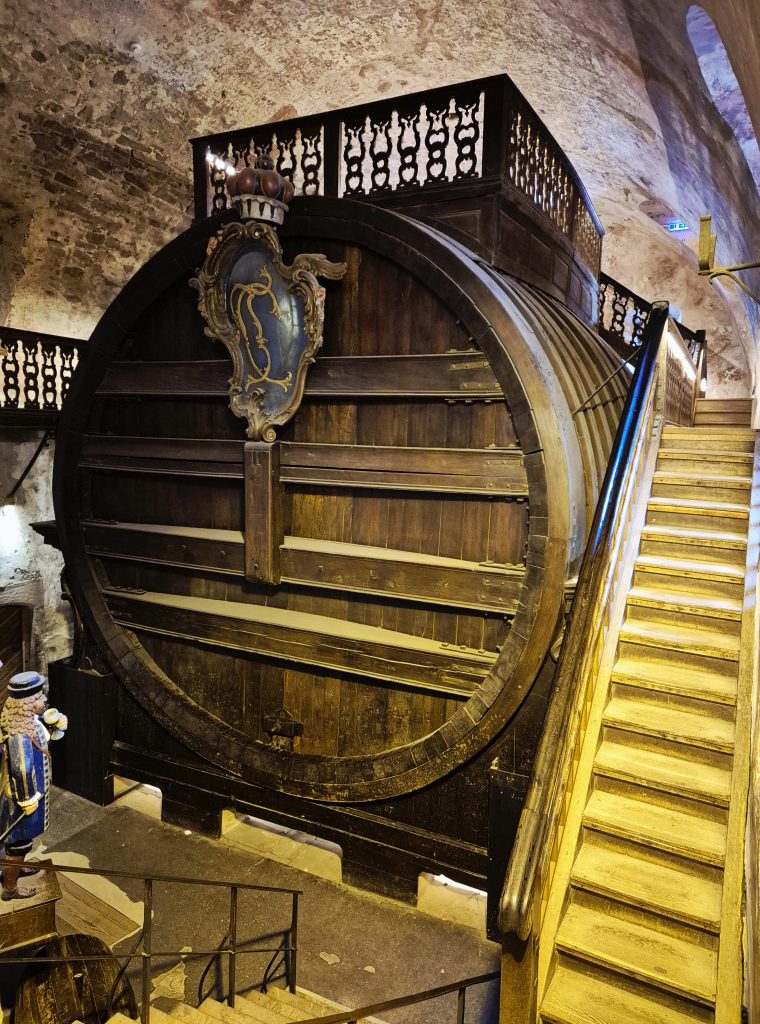 Bevor die Schlossführung losging, hatte ich noch die Möglichkeit, das größte Weinfass der Welt zu bestaunen, das sich im Keller des Heidelberger Schlosses befindet. Es wurde 1751 gebaut, fasst ca. 219.000 Liter Wein 😯 und hat sogar eine eigene Tanzfläche auf der Oberseite. Damit die Hofgesellschaft nicht immer in den Keller laufen musste, gab es sogar eine installierte Weinleitung. Mit einer Pumpe konnte der Wein direkt aus dem riesigen Fass in den darüber liegenden Königssaal befördert werden – quasi das erste „Beer-Tapping-System“ der Geschichte, nur eben mit Wein. 🍷😄