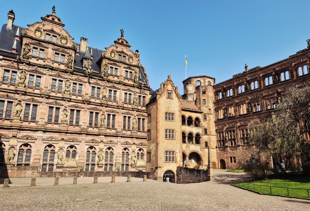 Der Friedrichsbau (links, 1607) ist im Stil der „deutschen Renaissance“ gebaut, die wuchtiger wirkt und deutlich mehr in die Höhe strebt als die italienischen Bauten. Der Gläserne Saalbau (Mitte, ca. 1545) ist das älteste der drei Gebäude. Man sieht ihm an, dass die Baumeister damals noch mit dem neuen Stil aus Italien experimentierten – die Formen wirken noch ein wenig massiv und „plump“. Der Ottheinrichsbau (rechts, 1556), der elf Jahre später erbaut wurde, zeugt davon, dass man fleißig geübt hatte – denn dieser Bau ist ein echtes Meisterwerk und kommt der zarten, eleganten Formensprache des italienischen Vorbilds von allen Gebäuden am nächsten.