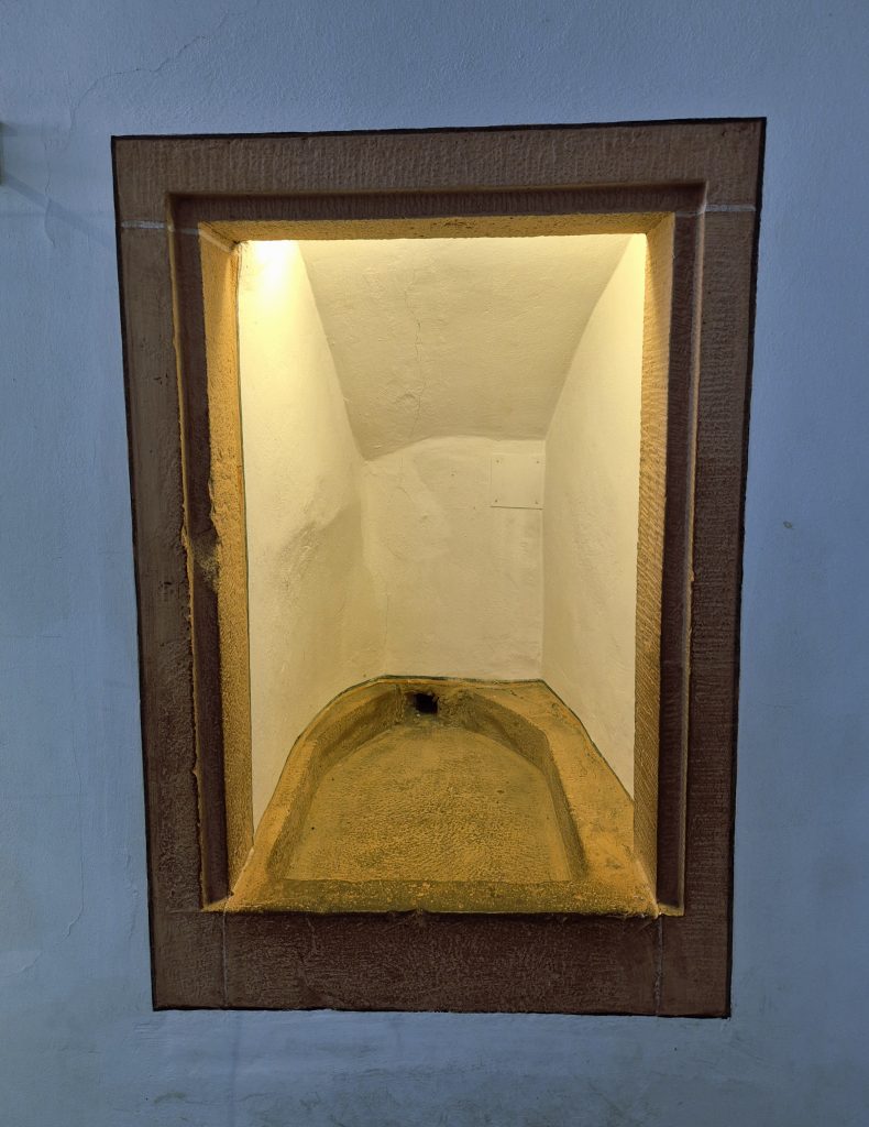Im zweiten Bild sieht man ein Spukbecken. Bei festlichen Anlässen wurden damals drei bis fünf Hauptgänge serviert. Einen „Gang“ darf man sich jedoch nicht wie heute als einen einzelnen Teller vorstellen. Pro Gang wurden oft zehn bis zwanzig verschiedene Gerichte gleichzeitig auf den Tisch gestellt (der sogenannte Service à la française). Ein typisches Festmenü umfasste somit insgesamt oft zwischen 30 und 100 Einzelspeisen 😐, von kräftigen Wildgerichten und Pasteten bis hin zu aufwendigen Zuckerbauten als Dessert. Dazu wurde reichlich Wein gereicht – oft wurde nach jedem Gang ein offizieller Trinkspruch ausgebracht. Die Gäste haben bei diesen riesigen Mengen natürlich nicht alles gegessen. Es ging darum, aus der Fülle zu wählen – und zu zeigen, dass der Kurfürst es sich leisten konnte, so viel Essen (und Wein!) aufzutischen. Und wenn mal doch jemand alles probieren wollte, gab es das Spukbecken. 🤮