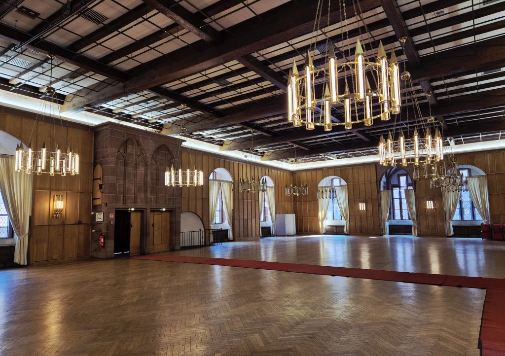 Jedoch wurden einige Räumlichkeiten im Ottheinrichs- und Friedrichsbau renoviert und diese können im Rahmen der Schlossführung besichtigt werden, darunter auch der bereits erwähnte Königssaal (mit der einstigen Weinleitung). Der Königssaal wurde ursprünglich von Ludwig V. als prächtiger Festsaal errichtet. Nach einem verheerenden Brand im Jahr 1689, in dem er komplett zerstört wurde, diente er vor allem wirtschaftlichen Zwecken. Unter anderem wurde hier ein Teil des Großen Fasses zusammengebaut. Das heutige Erscheinungsbild des Saals stammt aus dem 20. Jhd. Im Jahr 1934 ließen die Nationalsozialisten den Raum renovieren, um ihn für ihre Propaganda-Zwecke wieder als repräsentativen Festsaal zu nutzen. Heutzutage kann für diverse Veranstaltungen, vornehmlich Hochzeiten, gebucht werden (Bild 6).