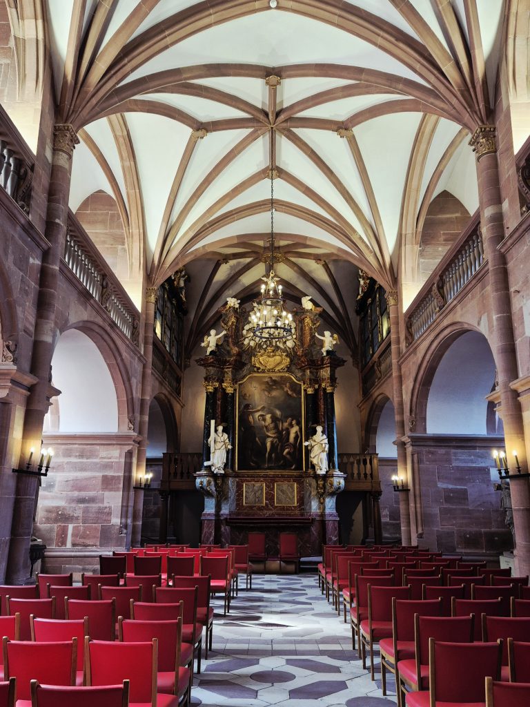 Zum Ende der Führung besuchten wir noch die Schlosskapelle im Friedrichsbau. Sie wurde Anfang des 17. Jhd. unter Kurfürst Friedrich IV. fertiggestellt. Ursprünglich als protestantisches Gotteshaus geplant, wurde sie nach der Rückkehr zum Katholizismus umgestaltet. Friedrich IV, der Regent der Kurpfalz von 1592 bis 1610, ist der Namensgeber des Friedrichbaus von 1607. Er war dem Wein sichtlich nicht abgetan. In seinem Tagebuch findet sich auffallend oft das ehrliche Geständnis ‚bin scheins wieder voll gewest‘.