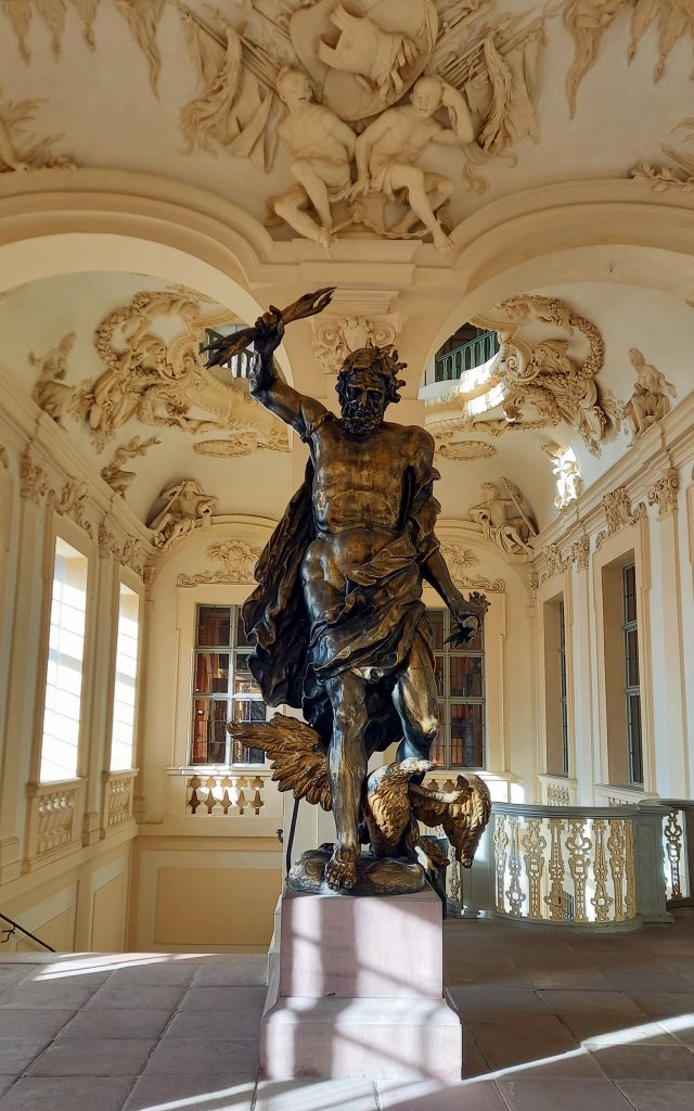 Nachdem man das Schloss durch den Ehrenhof betreten hat und durch den Eingangsbereich hindurchgeschritten ist, gelangt man über zwei prunkvolle Treppenhäuser in das Herzstück des Haupthauses – den Ahnensaal. Vorher passiert man die Nachbildung des Jupiters bzw. „Goldenen Mannes“, den man auch auf dem Dach sehen kann und der Blitze Richtung des damaligen Feindes, Frankreich, schleudert.