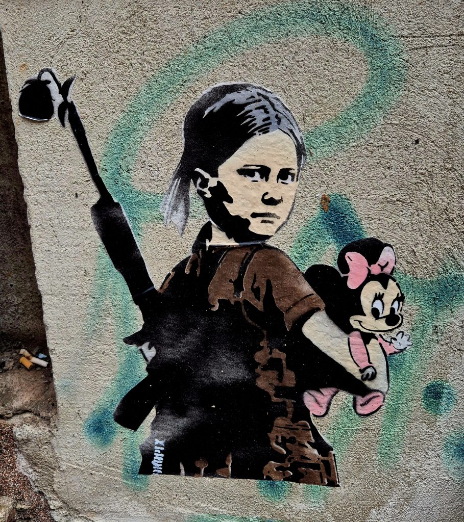 Unser erster Stopp war eine Künstlerwand in der Körnerstraße. Hier zeigen kleine Kunstwerke die verschiedenen Techniken, das „klassische“ Graffiti, Stencil (Schablonengraffiti), Paste-ups (Gedruckte oder gezeichnete Motive werden mit Kleister an Wände geklebt), Sticker oder auch Origami. Einige der Motive sind gesellschaftskritisch oder/und üben Kritik an der Politik.