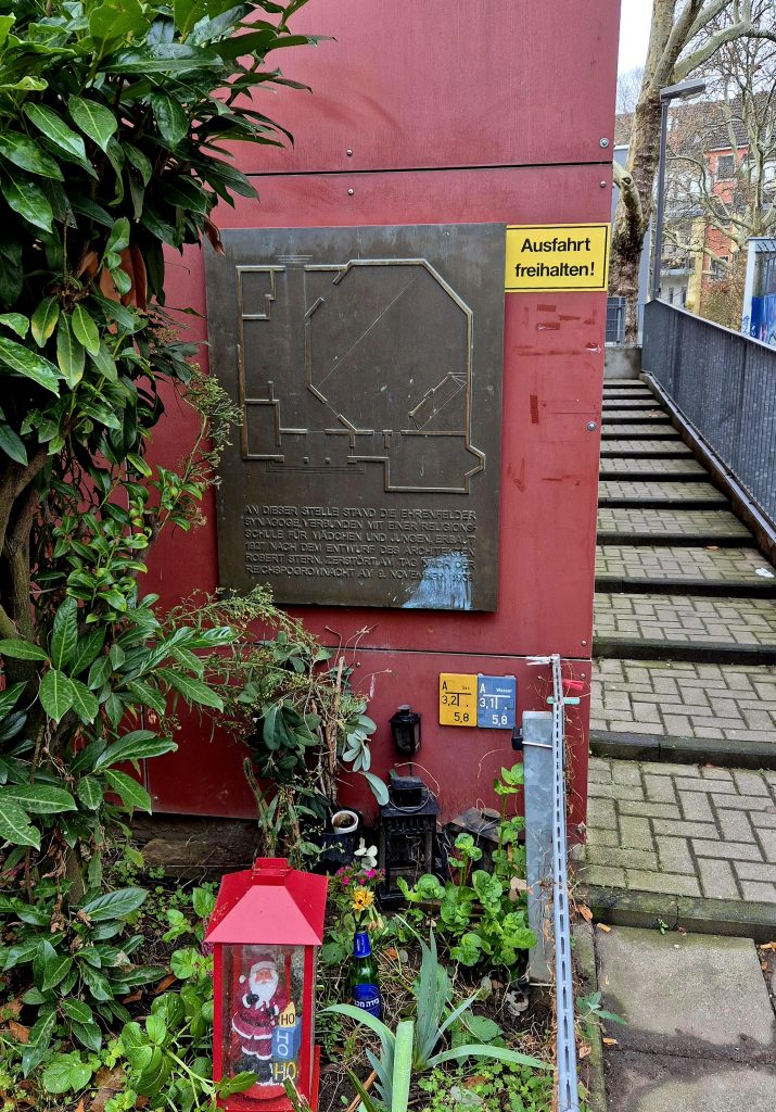 Neben dem Bunker stand bis 1938 die Synagoge Ehrenfeld. 1927 wurde dort eine jüdische Synagoge eingeweiht, die auch eine angeschlossene Religionsschule hatte. Architekt war der bekannte Kölner Robert Stern. In der Nacht vom 9. auf den 10. November 1938 – im Rahmen der Novemberpogrome – wurde die Synagoge bis auf die Außenmauern zerstört. 😢 Heute erinnert eine Gedenktafel an diese damalige Grausamkeit sowie ein Wandgemälde im hinteren Innenhof: an einer blauen Wand sieht man mehrere Sterne und in der Mitte den Davidsterne.