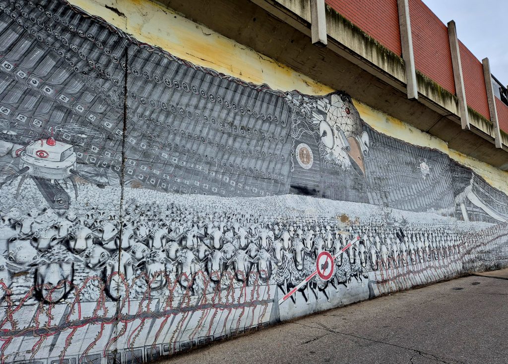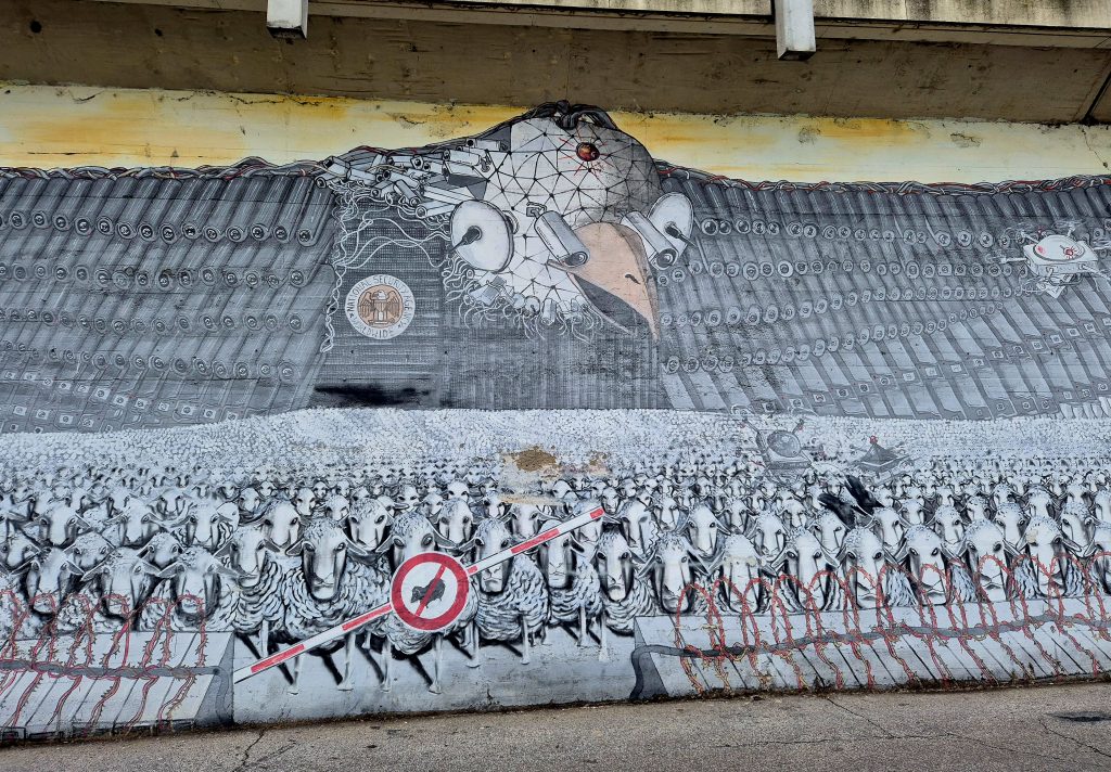 1) Der mächtige amerikanische Adler überwacht eine Herde ahnungsloser Schafe: Das 2013 entstandene Mural trägt den Titel „Surveillance of the Fittest“ und nimmt den NSA-Spionage-Skandal kritisch unter die Lupe. Mit seiner symbolträchtigen Darstellung hinterfragt das Werk die Überwachungsgesellschaft und den Verlust von Privatsphäre in Zeiten massiver digitaler Kontrolle.