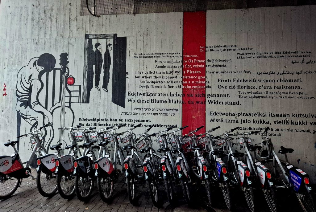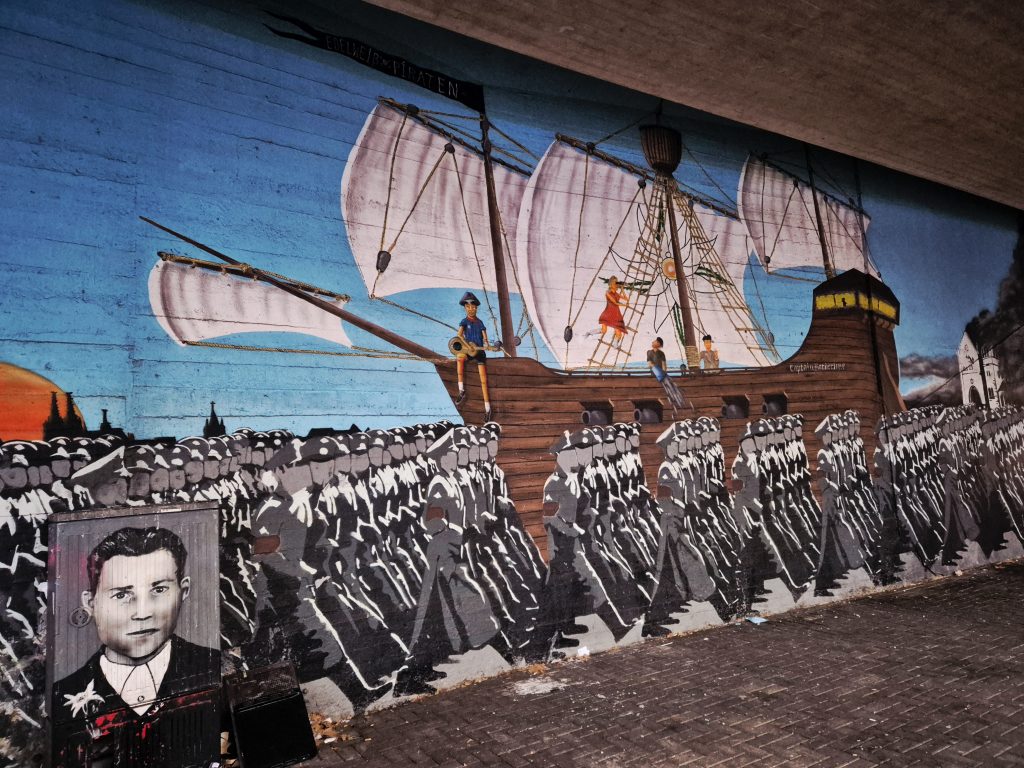 2) Während der NS-Zeit wurden Mitglieder der Kölner Edelweiß-Piraten in der Nähe des heutigen Ehrenfelder Bahnhofs hingerichtet. Captain Borderline hat ihnen ein eindrucksvolles Denkmal gesetzt. In der Straßenunterführung prangen die Namen der Opfer zwischen filigranen Edelweißblüten, daneben thront ein Schiff, auf dem die Edelweiß-Piraten über den Köpfen der Faschisten stehen – ein beeindruckendes Beispiel dafür, wie Street Art Geschichte lebendig hält.